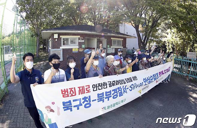 (광주=뉴스1) 허단비 기자 = 15일 광주 북구청 직원들과 북부경찰서, 효령노인복지타운 Silver안심순찰대원들이 공중화장실에서 불법촬영 카메라 탐지기를 이용한 합동 점검을 하고 있다.(광주북구 제공)2021.9.16/뉴스1