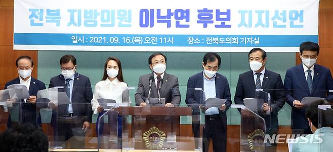 [전주=뉴시스] 김얼 기자 = 전북지역 지방의원들이 16일 전북 전주시 전북도의회 브리핑룸에서 이낙연 더불어민주당 대선 경선 후보 지지 선언 기자회견을 열고 선언문을 낭독하고 있다. 2021.09.16. pmkeul@newsis.com