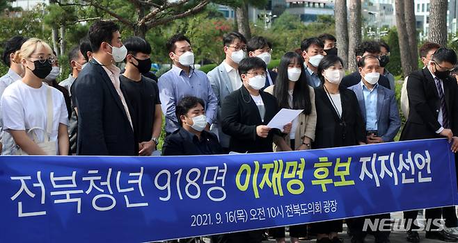 [전주=뉴시스] 김얼 기자 = 전북청년 918명 일동이 16일 전북 전주시 전북도의회 입구에서 이재명 더불어민주당 대선 경선 후보 지지 선언 기자회견을 열고 선언문을 낭독하고 있다. 2021.09.16. pmkeul@newsis.com