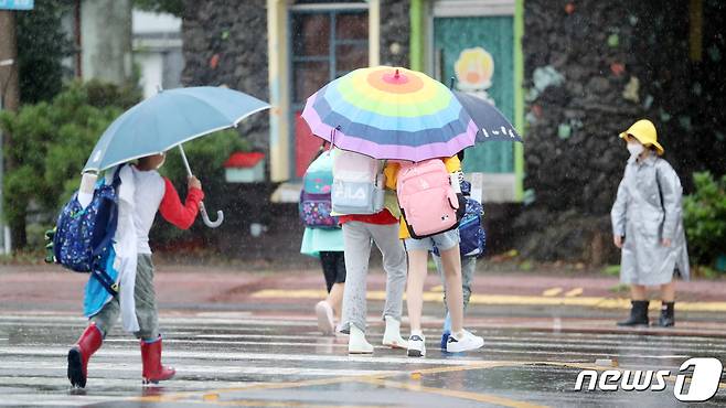 (서귀포=뉴스1) 오현지 기자 = 제14호 태풍 '찬투(CHANTHU)'가 북상 중인 16일 오전 하교한 초등학생들이 제주 서귀포시 표선면의 한 횡단보도를 건너고 있다.
