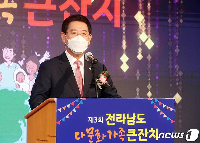 (나주=뉴스1) 전원 기자 = 김영록 전라남도지사가 16일 오전 나주시 다도면 중흥골드스파&리조트에서 열린 제3회 전라남도 다문화가족 큰잔치에서 개회사를 하고 있다. 이날 행사는 ‘다문화가족과 함께하는 가족사랑ㆍ남도사랑‘ 이라는 주제로 개최됐다. (전남도 제공) 2021.9.16/뉴스1