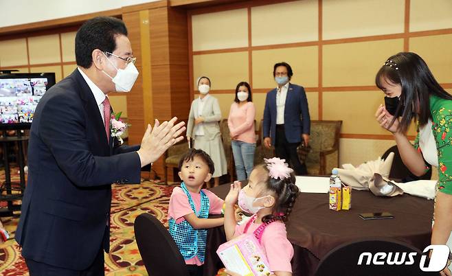(나주=뉴스1) 전원 기자 = 김영록 전라남도지사가 16일 오전 나주시 다도면 중흥골드스파&리조트에서 열린 제3회 전라남도 다문화가족 큰잔치에 참석, 다문화가족과 인사를 나누고 있다. 이날 행사는 ‘다문화가족과 함께하는 가족사랑ㆍ남도사랑‘ 이라는 주제로 개최됐다. (전남도 제공) 2021.9.16/뉴스1