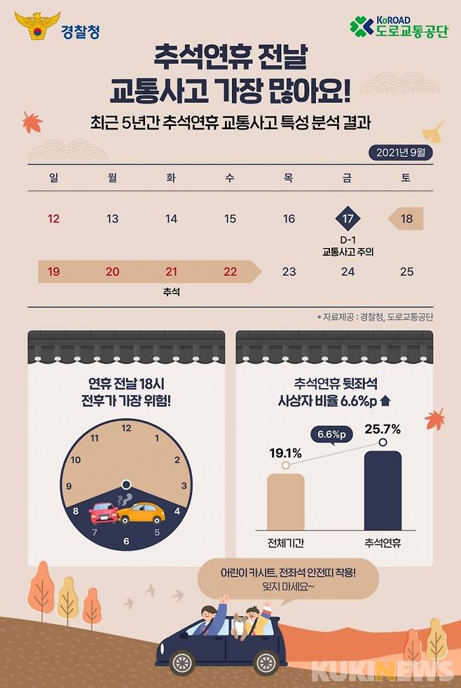 사상자 비율은 평소보다 어린이가 1.4배, 뒷좌석은 1.3배 증가해 동승 중인 가족들의 안전에 주의가 필요하다.