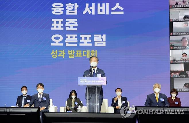 (서울=연합뉴스) 박진규 산업통상자원부 1차관이 16일 오후 웨스틴 조선호텔 서울 그랜드볼룸에서 열린 '융합서비스표준오픈포럼 성과 발표대회'에서 축사하고 있다. 2021.9.16