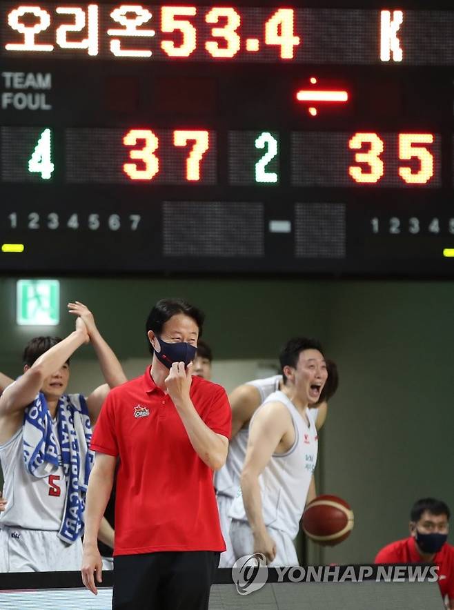 오리온 강을준 감독이 역전에 성공하자 밝게 웃고 있다. 2021.9.16