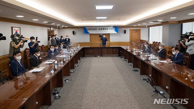 [서울=뉴시스] 배훈식 기자 = 고승범 금융위원장을 비롯한 참석자들이 16일 오후 서울 중구 은행회관에서 열린 금융위원장-금융협회장 간담회 시작을 기다리고 있다. (공동취재사진) 2021.09.16. photo@newsis.com