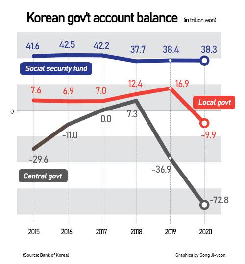 The red figure of 73 trillion won nearly doubles 36.9 trillion won in 2019 to the largest-ever since 2007 when the data became available. The central government¡¯s gross income decreased by 2.5 trillion won compared to the previous year as tax revenue decreased, but its expenditure sharply increased by 33.4 trillion won due to the Covid-19 relief handouts.