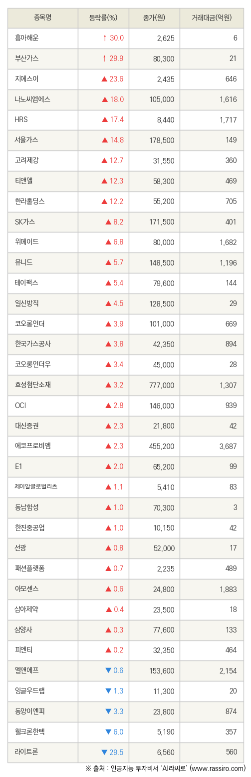 [fnRASSI]흥아해운, 부산가스 등 36종목 52주 신고가 경신