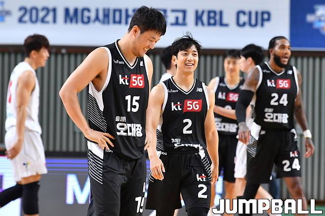 16일 경상북도 상주시 상주실내체육관에서 열린 2021 MG새마을금고 KBL컵 대회 수원 KT와 고양 오리온의 경기, KT 허훈과 김동욱이 환하게 웃고 있다.