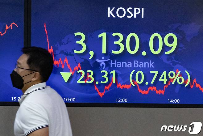 (서울=뉴스1) 이재명 기자 = 16일 오후 서울 중구 하나은행 명동점 딜링룸 전광판에 코스피지수가 전 거래일 대비 23.31포인트(0.74%) 내린 3,130.09를 나타내고 있다.