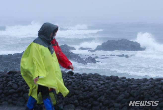 [서귀포=뉴시스] 우장호 기자 = 제14호 태풍 '찬투(CHANTHU)'가 북상 중인 16일 오후 제주 서귀포시 남원읍 태흥2리 인근 도로에서 올레꾼이 걸어가고 있다. 2021.09.16. woo1223@newsis.com