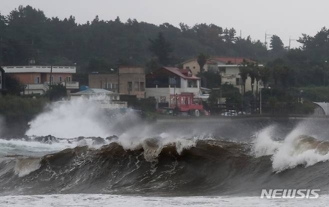 [서귀포=뉴시스] 우장호 기자 = 제14호 태풍 '찬투(CHANTHU)'가 북상 중인 16일 오후 제주 서귀포시 표선면 토산2리 인근 앞바다에 거친 파도가 몰아치고 있다. 2021.09.16. woo1223@newsis.com