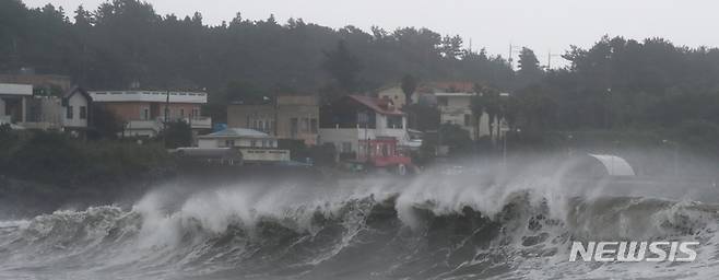 [서귀포=뉴시스] 우장호 기자 = 제14호 태풍 '찬투(CHANTHU)'가 북상 중인 16일 오후 제주 서귀포시 표선면 토산2리 인근 앞바다에 거친 파도가 몰아치고 있다. 2021.09.16. woo1223@newsis.com