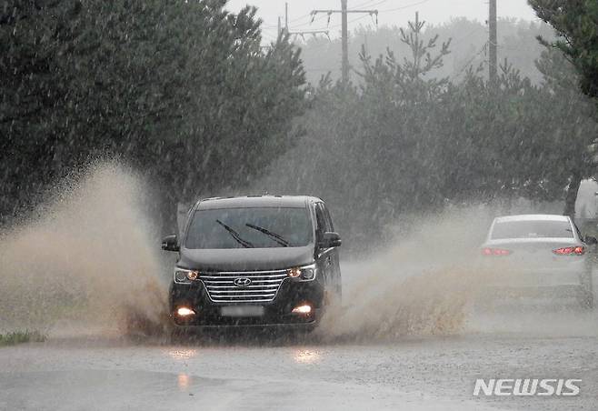 [서귀포=뉴시스] 우장호 기자 = 제14호 태풍 '찬투(CHANTHU)'가 북상 중인 16일 오후 제주 서귀포시 남원읍 태흥2리 인근 도로에서 차량들이 물보라를 일으키며 달리고 있다. 기상청은 태풍이 17일 오전 3시 서귀포 남남서쪽 110㎞까지 접근해 같은 날 오전 9시 서귀포 동남동쪽 약 50㎞ 해상까지 진출할 것으로 예보했다. 2021.09.16. woo1223@newsis.com