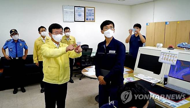 (서울=연합뉴스) 문성혁 해양수산부 장관(앞줄 왼쪽)이 16일 추석 연휴를 앞두고 인천 연안여객터미널을 방문해 특별수송대책 상황을 점검하고 있다. 2021.9.16