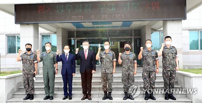 (서울=연합뉴스) 정석환 병무청장(왼쪽 네 번째)이 추석명절을 앞둔 16일 오후 공군 제17전투비행단을 방문해 군 장병들을 격려하고 부대 관계자들과 기념촬영을 하고 있다. 2021.9.16
