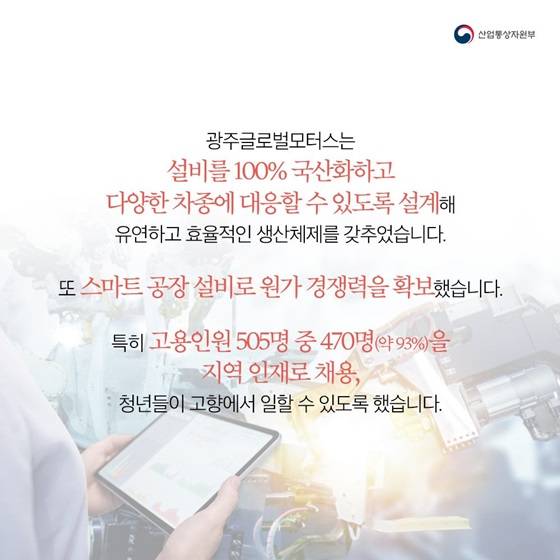 광주글로벌모터스는 설비를 100% 국산화하고 다양한 차종에 대응할 수 있도록 설계해 유연하고 효율적인 생산체제를 갖추었습니다.