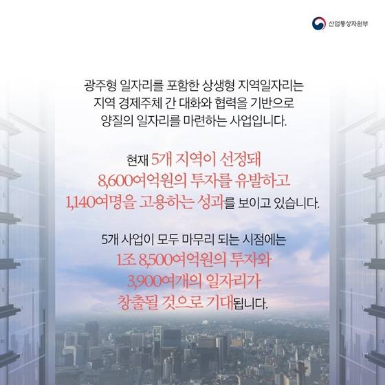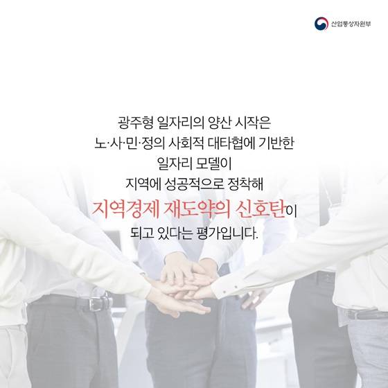 광주형 일자리를 포함한 상생형 지역일자리는 지역 경제주체 간 대화와 협력을 기반으로 양질의 일자리를 마련하는 사업입니다.