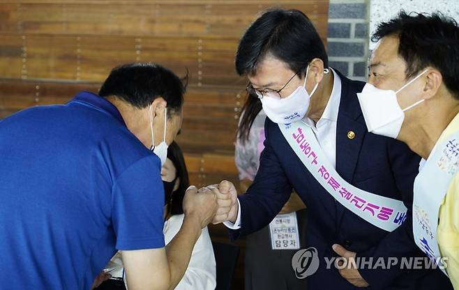 (서울=연합뉴스) 문성혁 해양수산부 장관(오른쪽 두 번째)이 16일 수산물 소비촉진 행사가 열린 인천 소래포구 전통어시장을 방문해 관계자와 인사하고 있다. 2021.9.16
