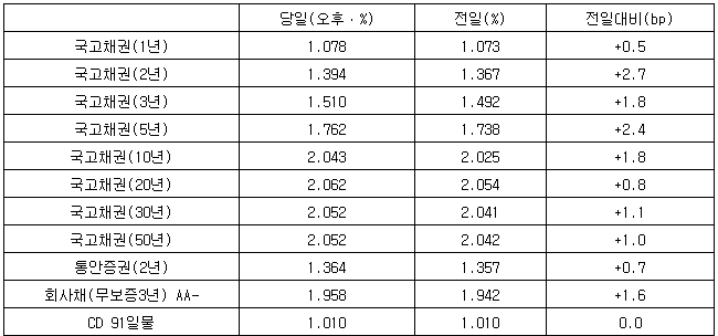 10년물 금리는 연 2.043%로 1.8bp 상승했다. 5년물과 2년물은 각각 2.4bp 상승, 2.7bp 상승으로 연 1.762%, 연 1.394%에 마감했다.