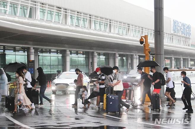 [제주=뉴시스] 양영전 기자 = 제14호 태풍 ‘찬투’가 제주와 가까워지고 있는 16일 오후 제주국제공항에서 관광객들이 발걸음을 재촉하고 있다. 2021.09.16. 0jeoni@newsis.com