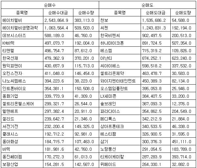 [표] 코스닥 외국인 순매수도 상위종목(16일)