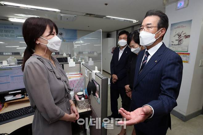 [이데일리 김태형 기자] 이성희(오른쪽) 농협중앙회장이 16일 서울 용산구 농협 고객행복센터를 방문하여 추석 연휴 고객상담전화 응대를 위해 비상근무에 임하는 직원들을 격려하고 있다.