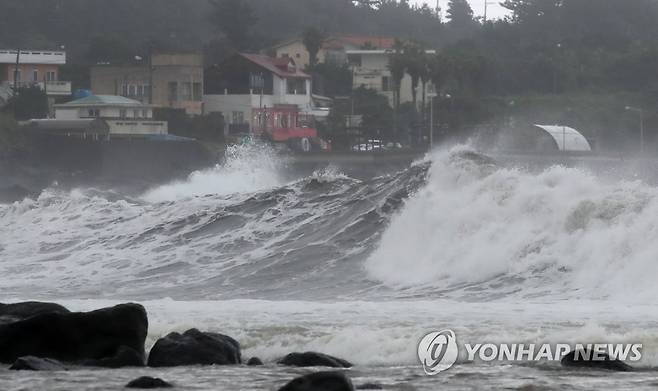 (서귀포=연합뉴스) 박지호 기자 = 태풍 '찬투'가 북상하는 가운데 16일 오후 제주 서귀포시 표선면 토산2리 앞바다에 거센 파도가 몰아치고 있다. 2021.9.16