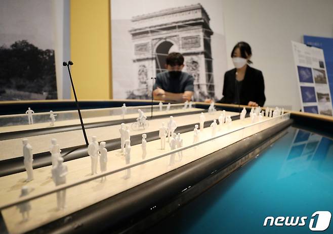 (서울=뉴스1) 김진환 기자 = 16일 서울 동대문디자인플라자(DDP)에서 열린 ‘2021 서울도시건축비엔날레’ 개막식에서 시민들이 관람하고 있다.