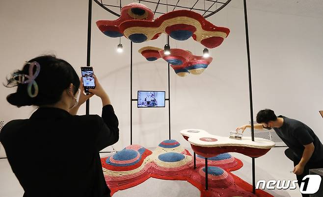 (서울=뉴스1) 김진환 기자 = 16일 서울 동대문디자인플라자(DDP)에서 열린 ‘2021 서울도시건축비엔날레’ 개막식에서 시민들이 관람하고 있다.