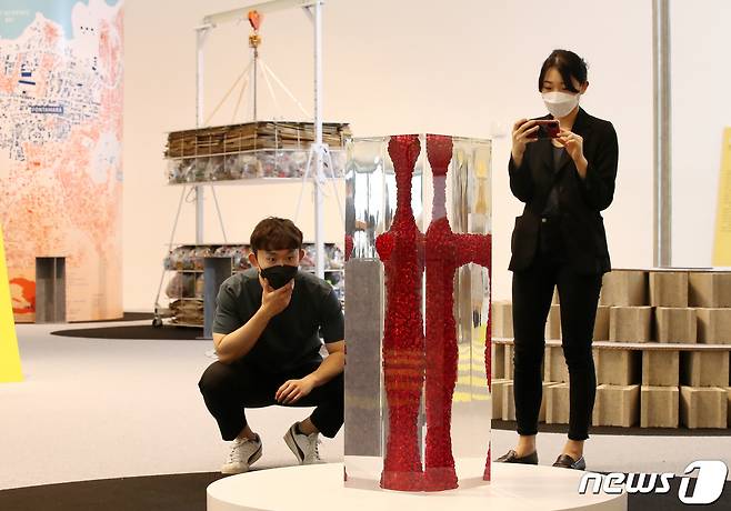 (서울=뉴스1) 김진환 기자 = 16일 서울 동대문디자인플라자(DDP)에서 열린 ‘2021 서울도시건축비엔날레’ 개막식에서 시민들이 관람하고 있다.