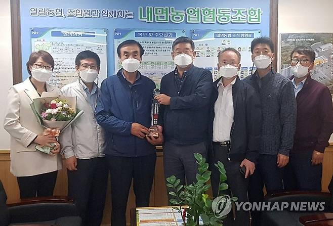 (홍천=연합뉴스) 16일 강원 홍천군 내면농협에서 임직원들이 장덕수 농협 강원지역본부장으로부터 상호금융대출금 500억원 달성탑을 받은 뒤 기념촬영을 하고 있다.