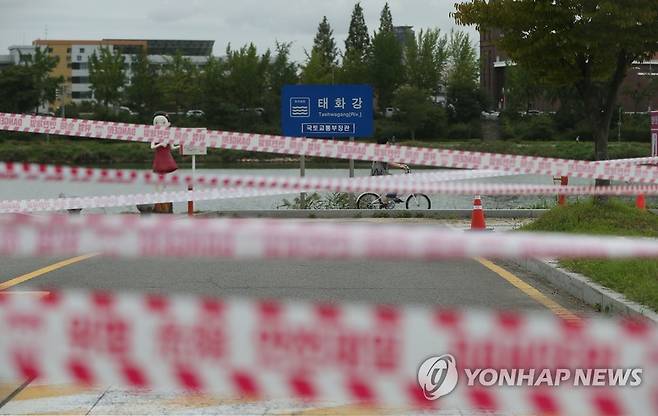 (울산=연합뉴스) 김용태 기자 = 제14호 태풍 '찬투'가 북상하고 있는 16일 오후 울산시 중구 태화강변 공영주차장에 차량 진입이 통제되고 있다. 2021.9.16