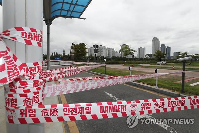 (울산=연합뉴스) 김용태 기자 = 제14호 태풍 '찬투'가 북상하고 있는 16일 오후 울산시 중구 태화강변 공영주차장에 차량 진입이 통제되고 있다. 2021.9.16