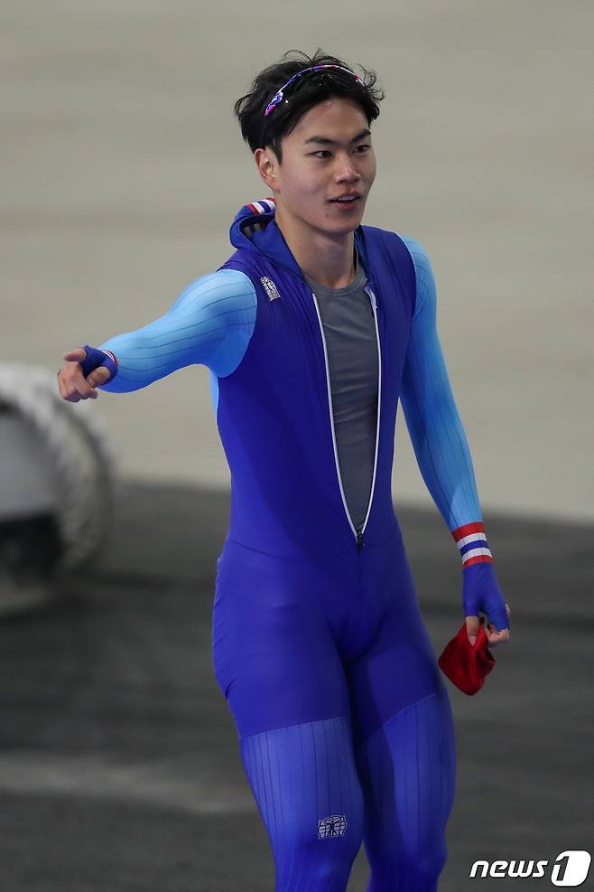 (서울=뉴스1) 안은나 기자 = 16일 서울 노원구 태릉국제스케이트장에서 열린 SK텔레콤배 제56회 전국남녀 종목별 스피드스케이팅 선수권대회 남자 1000m 결승에서 김민석(성남시청)이 결승선을 통과한 뒤 기뻐하고 있다. 김민석은 1분09초83으로 1위를 차지하며 모태범(1분09초95)의 이전 기록을 깼다. 2021.9.16/뉴스1