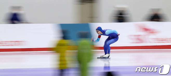 (서울=뉴스1) 안은나 기자 = 16일 서울 노원구 태릉국제스케이트장에서 열린 SK텔레콤배 제56회 전국남녀 종목별 스피드스케이팅 선수권대회 남자 1000m 결승에서 김민석(성남시청)이 역주하고 있다. 김민석은 1분09초83으로 1위를 차지하며 모태범(1분09초95)의 이전 기록을 깼다. 2021.9.16/뉴스1