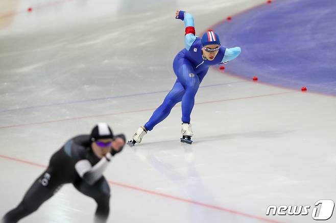 (서울=뉴스1) 안은나 기자 = 16일 서울 노원구 태릉국제스케이트장에서 열린 SK텔레콤배 제56회 전국남녀 종목별 스피드스케이팅 선수권대회 남자 1000m 결승에서 김민석(성남시청, 위)과 김태윤(서울시청 스피드팀)이 역주하고 있다. 김민석은 1분09초83으로 1위를, 김태윤은 1분10초21로 2위를 차지했다. 2021.9.16/뉴스1