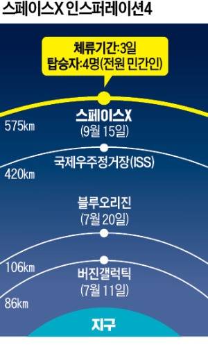 크루드래건의 목표 고도는 약 575㎞다. 7월 11일 발사된 버진갤럭틱 우주선(86㎞)과 9일 뒤 쏘아올려진 블루오리진 우주선(106㎞)보다 훨씬 높은 고도를 향해 비행하고 있다. 국제우주정거장(ISS)이 떠있는 420㎞ 고도와 지구를 내려다보는 허블 우주망원경이 머무르는 540㎞보다도 높다.