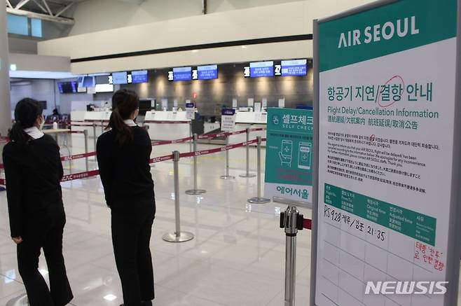 [제주=뉴시스] 양영전 기자 = 제14호 태풍 ‘찬투’가 제주와 가까워지고 있는 16일 오후 제주국제공항 내 한 항공사 발권데스크 앞에 태풍으로 인한 결항 소식을 알리는 안내판이 세워져 있다. 2021.09.16.
