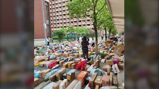 코로나19 방역으로 외부인의 교내 출입이 금지되면서 생필품을 직접 전달하지 못한 부모들이 각종 물품을 택배로 보내면서 만들어진 풍경입니다.