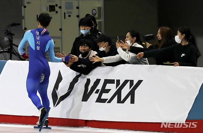 [서울=뉴시스] 홍효식 기자 = 16일 오후 서울 노원구 태릉 국제스케이트장에서 열린 SK텔레콤배 제56회 전국남녀 스피드 스케이팅 선수권대회, 남자부 1000M 결승에서 김민석(성남시청)이 질주한 뒤 지인들과 하이파이브를 하고 있다. 김민석은 1:09.83로 1위를 기록했다. 2021.09.16. yesphoto@newsis.com