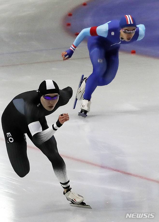 [서울=뉴시스] 홍효식 기자 = 16일 오후 서울 노원구 태릉 국제스케이트장에서 열린 SK텔레콤배 제56회 전국남녀 스피드 스케이팅 선수권대회, 남자부 1000M 결승에서 김민석(성남시청, 오른쪽)과 김태윤(서울시청 스피드팀) 질주하고 있다. 김민석은 1:09.83로 1위, 김태윤은 1:10.21로 2위를 기록했다. 2021.09.16. yesphoto@newsis.com