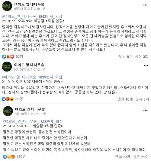 이러한 사연 탓에 보좌진들 사이에서는 갑론을박이 이어졌다. 한 보좌진은 “후보께서 오랜 시간 고민하고 결정했으니 존중하고 함께 하는 게 동지의 자세”라면서 “후회없이 끝까지 최선을 다하겠다”고 다짐했다. 또다른 보좌진의 글에서는 “5선이나 초선이나 직원들 목 날리고 장렬하게 나 죽겠다고 배째는 게 멋있다고 생각되나”라는 원색적인 비판도 쏟아졌다. 이밖에 “잘못은 영감이 했는데 짤리는 거 보좌진이네”라면서 “잘못도 없는 보좌진은 명절 일주일 앞두고 생계를 잃었네”라고 토로한 내용의 글도 올라왔다. 익명을 요구한 한 보좌진은 “밥벌이를 위해 당장 일자리를 찾아야 하는데 마땅한 자리가 없다”며 “주변 동료 보좌진들의 위로와 걱정에 힘을 얻는다”고 밝혔다.