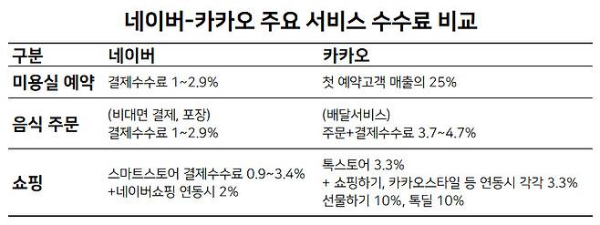 미용실·네일숍 예약 서비스 역시 마찬가지다. 카카오헤어샵의 경우 해당 매장에 처음 예약한 고객에 한해 매출의 25%를 수수료로 부과한다. 기존에는 첫 고객에는 12%, 재방문 예약건은 5%씩 수수료를 부과하다가 업계 반발에 정책을 최근처럼 변경했다. 하지만 네이버는 예약은 결제 수수료 외에는 별도의 비용이 발생하지 않는다.