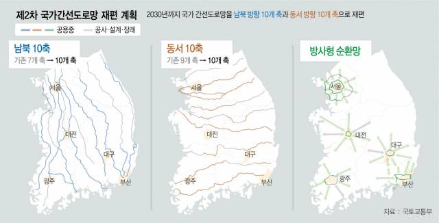 계획에 따르면 국가 도로망의 동맥에 해당하는 간선도로 체계가 지난 1992년 이후 약 30년 만에 재정비된다. 전국 어디에서나 간선도로에 더 편리하게 접근할 수 있도록 전체 국토 격자망을 기존 남북 방향 7개 축, 동서 방향 9개 축에서 남북 방향 10개 축, 동서 방향 10개 축으로 재편하는 것이 핵심이다. 대도시권의 교통 혼잡을 해소하기 위해서는 기존 순환형 도로망에 방사 축을 도입해 6개의 ‘방사형 순환망’을 만든다는 계획이다.