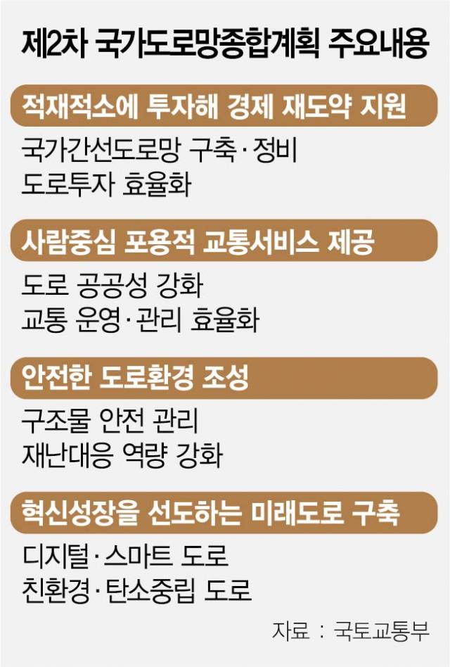 이번 2차 도로망 종합 계획은 이달 안으로 고시된다. 국토부는 종합 계획의 정책 방향에 맞춰 하위 계획인 건설 계획과 관리 계획도 단계적으로 발표한다. 이윤상 국토부 도로국장은 “이번 계획을 통해 자동차 중심에서 사람 중심의 도로를 만들고 이동성뿐 아니라 접근성·안전성도 강화해 새로운 가치를 아우를 수 있는 토대를 마련했다”며 “새롭게 재편된 간선도로망을 근간으로 전 국민이 30분 이내에 간선도로에 접근해 정체 구간 없이 편리하게 이용할 수 있도록 노력하겠다”고 말했다.