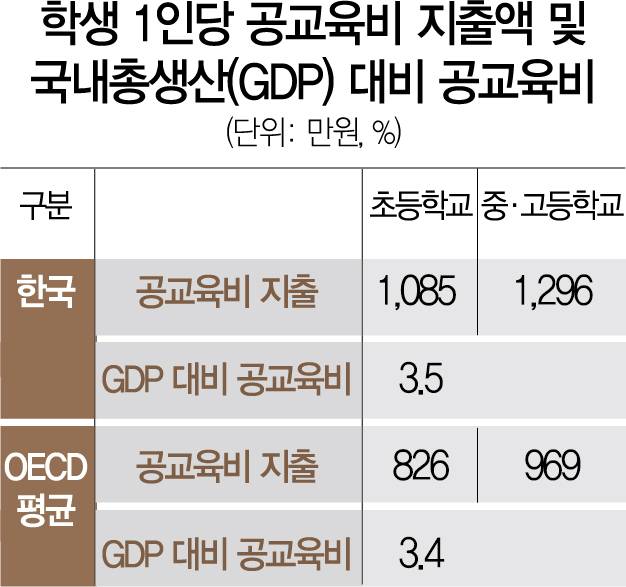 2018년 회계연도 기준 초등 공교육비는 1,085만 원으로 OECD 평균 826만 원보다 259만 원 많았다. 중고교 공교육비 1,296만 원은 OECD 평균 969만 원보다 327만 원 더 들었다. 초등학교와 중학교의 공교육 지출액도 전년 대비 각각 7%포인트, 10%포인트 상승했다.