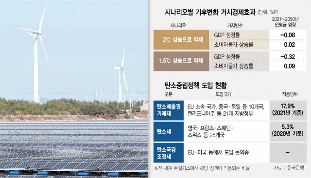 한은은 지구 평균온도 상승 폭을 산업화 이전 대비 1.5~2도 이내로 억제하는 경우와 온실가스 배출량을 100% 감축해 1.5도 이내로 막는 두 가지 시나리오로 나눠 분석했다. 정부 목표대로 완전한 탄소 중립을 이뤄내 지구 평균온도 상승 폭을 1.5도 이하로 낮추려면 우리나라 GDP는 매년 0.32%포인트 만큼 충격을 받고 물가도 0.09%포인트씩 오르는 상황을 감수해야 한다. 상승 폭이 2도만 돼도 GDP 충격은 0.08%포인트, 물가 상승은 0.02%포인트로 크게 완화된다.