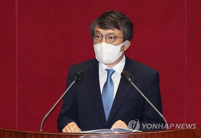 (서울=연합뉴스) 진성철 기자 = 열린민주당 김의겸 의원이 16일 서울 여의도 국회 본회의에서 진행된 교육·사회·문화 분야 대정부질문에서 조선일보사와 사주 일가의 부동산 현황에 대해 질의하고 있다. 2021.9.16 [국회사진기자단]