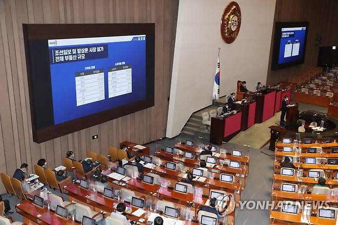 (서울=연합뉴스) 진성철 기자 = 열린민주당 김의겸 의원이 16일 서울 여의도 국회 본회의에서 진행된 교육·사회·문화 분야 대정부질문에서 조선일보사와 사주 일가의 부동산 현황에 대해 질의하고 있다. 2021.9.16 [국회사진기자단]